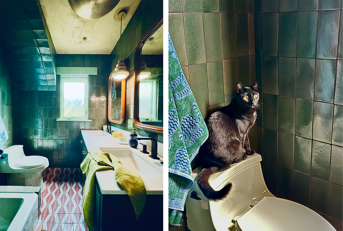 Designed in collaboration with Justina’s thirteen year old, Ida, this teen-friendly shared bathroom sits between Ida’s bedroom and Justina’s home office. Warm cotto tile, graphic cement tile flooring, amber-colored mirrors, matte black fixtures and a limewashed ceiling create a modern family bathroom that feels earthy, and is durable and timeless. This bathroom design is both practical and full of personality and designed to evolve as needs and style grow. Get the look below!